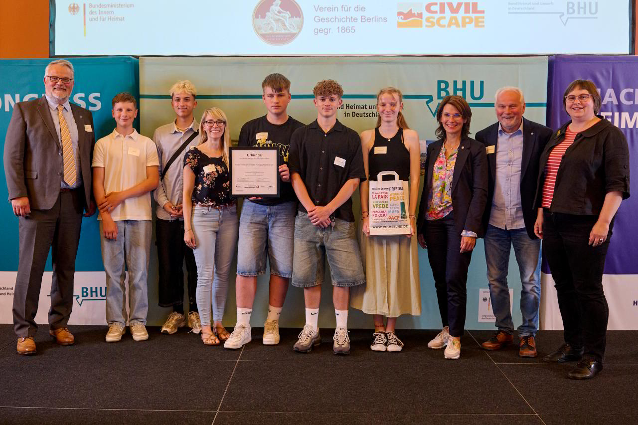 Krieg und Diktatur sind auch in unserer Gegenwart wieder Themen, mit denen wir uns auseinandersetzen müssen. Diesem Ziel fühlt sich der Förderverein Denkstätte Teehaus Trebbow bereits seit 20 Jahren verpflichtet. Er initiiert Projekten, die sich mit Widerstand und Zivilcourage in der Region befassen. So aktuell mit Schülerinnen und Schülern der Verbundenen Regionalschule und Gymnasium „Tisa von der Schulenburg“ Dorf Mecklenburg. Entstanden ist eine preisgekrönte Podcast-Reihe über Tisa von der Schulenburg. Diese erhielt bereits im Mai diesen Jahres den Medienkompetenzpreis MV 2024 für das Projekt: „Tisa von der Schulenburg in Mecklenburg“. Damit nicht genug! Am 24. Juni 2024 konnten der Verein und die beteiligten Schülerinnen und Schüler aus Dorf Mecklenburg für ein erweitertes Projekt „Tisa von der Schulenburg und der Widerstand des 20. Juli 1944, im Roten Rathaus von Berlin, einen der 5 (!) Preise für nachhaltiges Heimatengagement aus den Händen Händen der Staatssekretärin bei der Bundesministerin des Innern und für Heimat, Frau Rita Schwarzelühr-Sutter, entgegennehmen. Wir bedanken für den Vorschlag des Heimatverbandes Mecklenburg-Vorpommern in Person von Anna-Konstanze Schröder (MdL). Gefördert wurde dieses Projekt von der Landeszentrale f. politische Bildung M-V (LzpB M-V) und dem Projekt „Demokratie leben in NWM“.