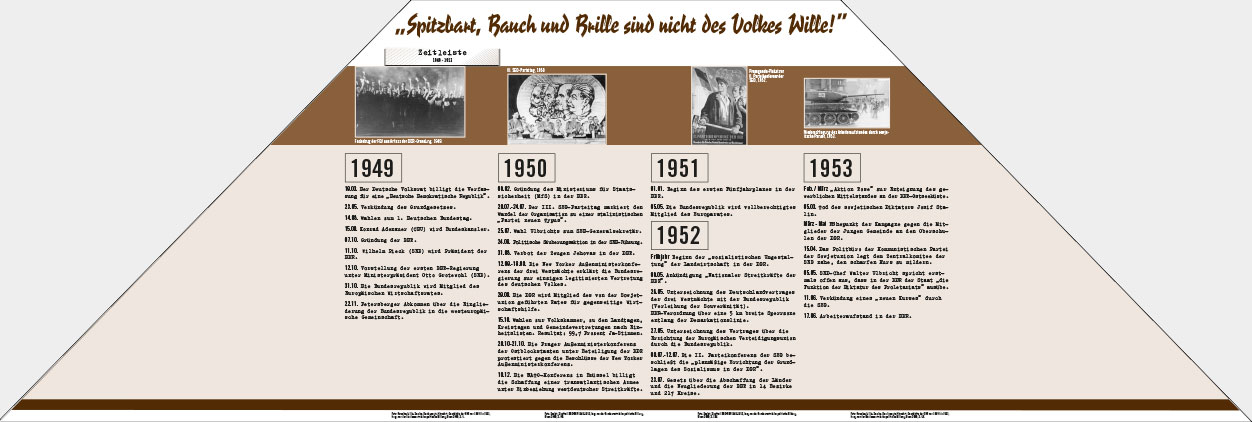 Danach kam es unter Einsatz härtester Repression zu einer den kommunistisch-stalinistischen Vorstellungen der Parteiführung entsprechenden Umformung von Staat und Gesellschaft. Ihr totalitärer Kurs, der erst mit dem Tod des sowjetischen Diktators Josif W. Stalin 1953 abgemildert wurde, zielte auf die Durchsetzung der „führenden Rolle” der Partei, die Errichtung eines Meinungsmonopols mit dem Marxismus-Leninismus als herrschender Ideologie, die Zerschlagung der Reste föderaler und kommunaler Selbstverwaltung, das Anwachsen des staatlichen Eigentums in Industrie und Handel, den Beginn der Zwangskollektivierung in der Landwirtschaft, den Aufbau einer zentral geleiteten Planwirtschaft sowie die verstärkte Politisierung von Justiz, Bildung und Kultur. Der zügige Ausbau der Diktatur, die immer härtere Verfolgung durch die sowjetischen Geheimpolizei und später durch das Ministerium für Staatssicherheit, der sich zuspitzende Ost-West-Konflikt sowie die verbreitete Hoffnung auf eine baldige Lösung der offenen deutschen Frage hatten ein erhebliches Maß von Opposition und Widerstand zur Folge. Höhepunkt war der spontane Arbeiteraufstand vom 17. Juni 1953, der ausgehend von Berlin, kurzfristig fast die gesamte DDR erfasste.